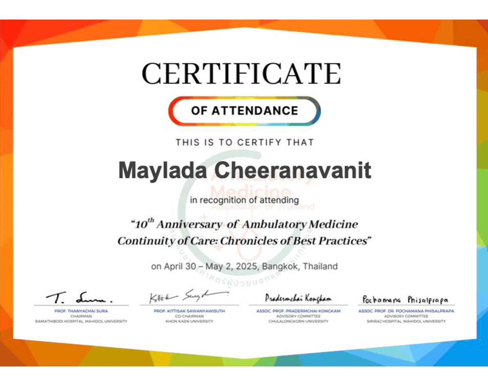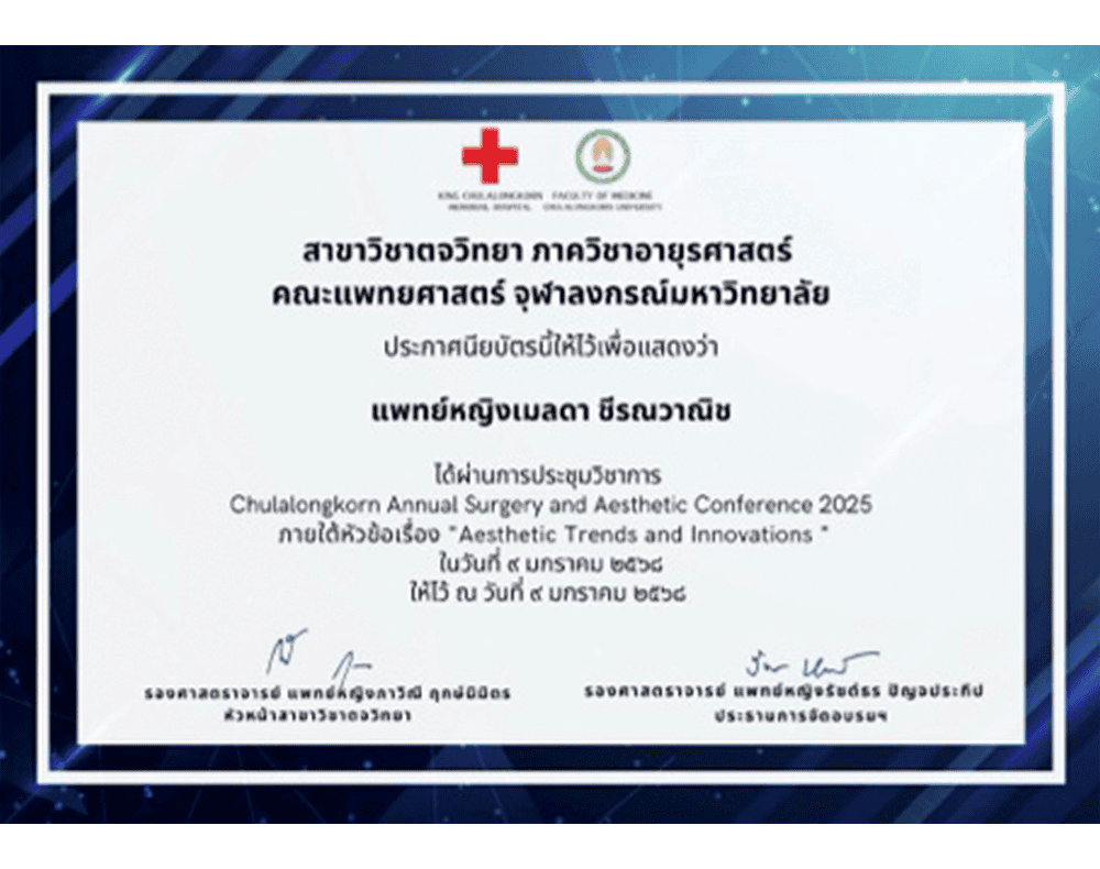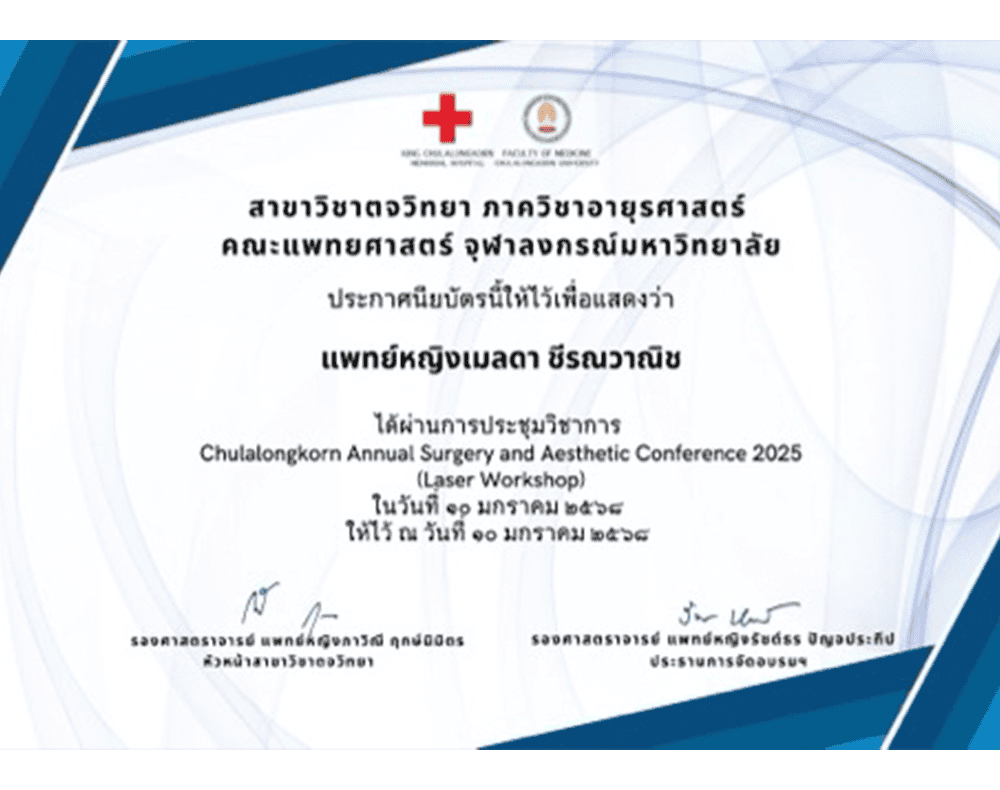 - วุฒิบัตรการเข้าร่วมเวิร์คช็อปเลเซอร์และเส้นผม CASA โรงพยาบาลจุฬาลงกรณ์ ปี 2025